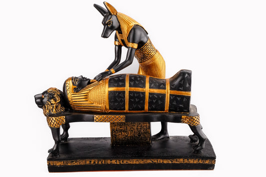 A unique ancient Egyptian statue of Anubis God of afterlife mummify king Tutankhamun, painted gold with colors Manifest piece made in Egypt