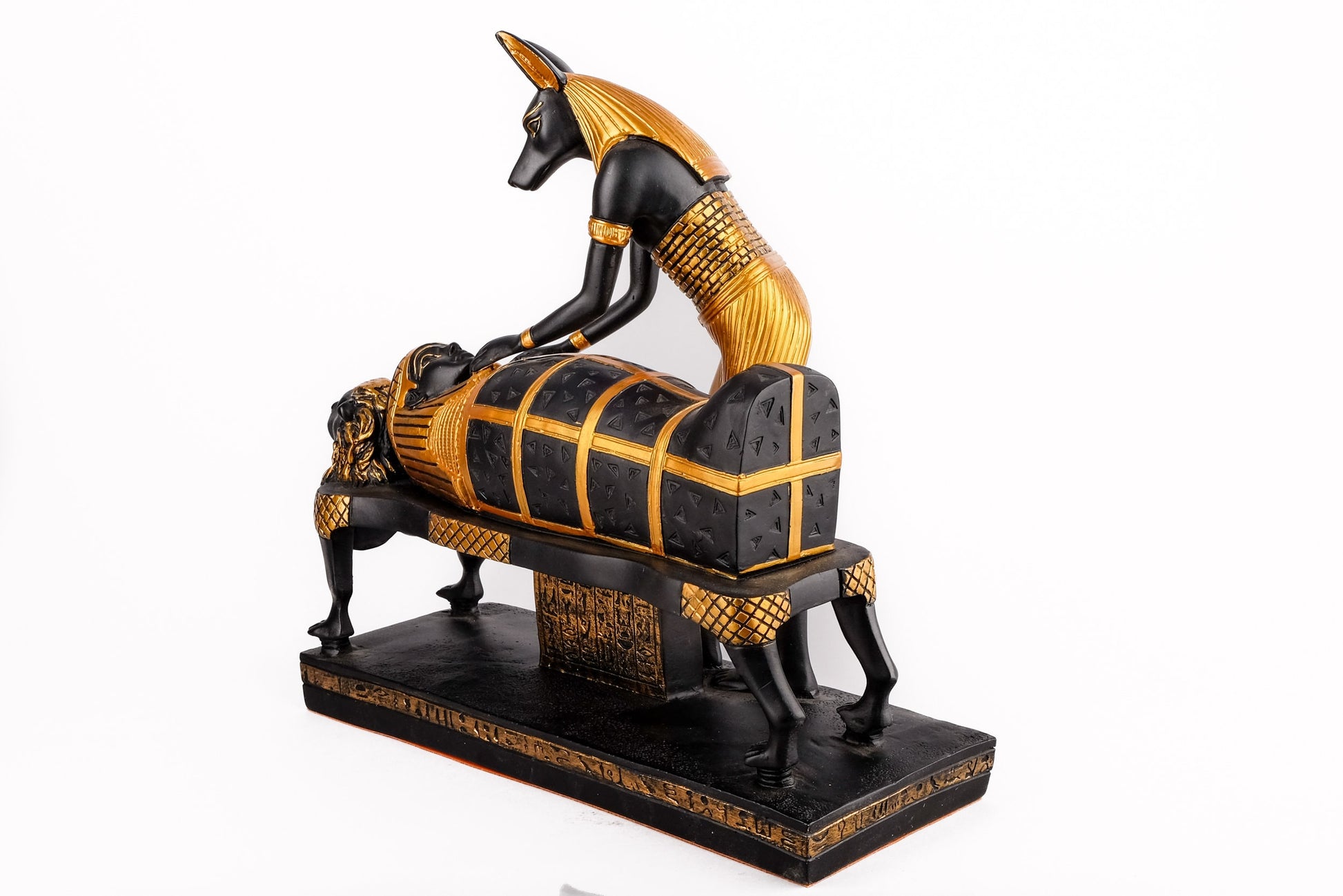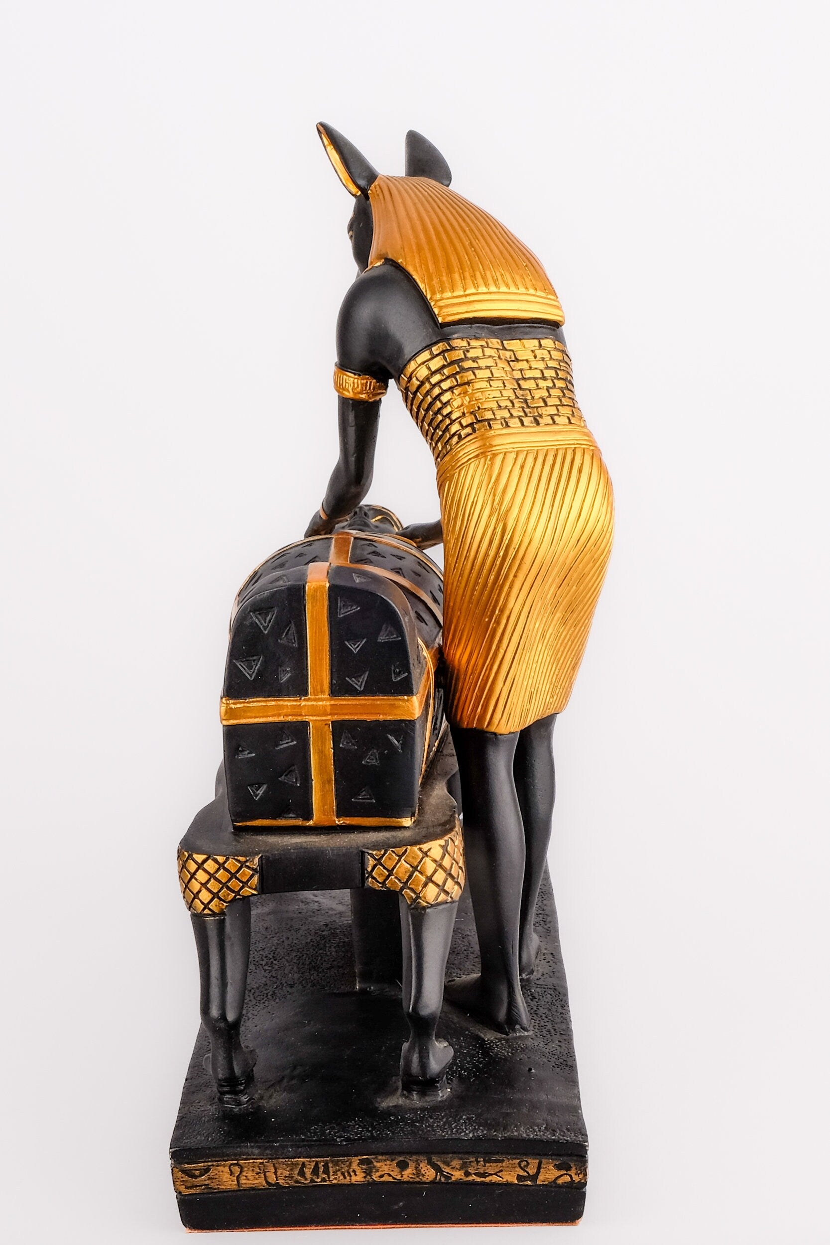 A unique ancient Egyptian statue of Anubis God of afterlife mummify king Tutankhamun, painted gold with colors Manifest piece made in Egypt