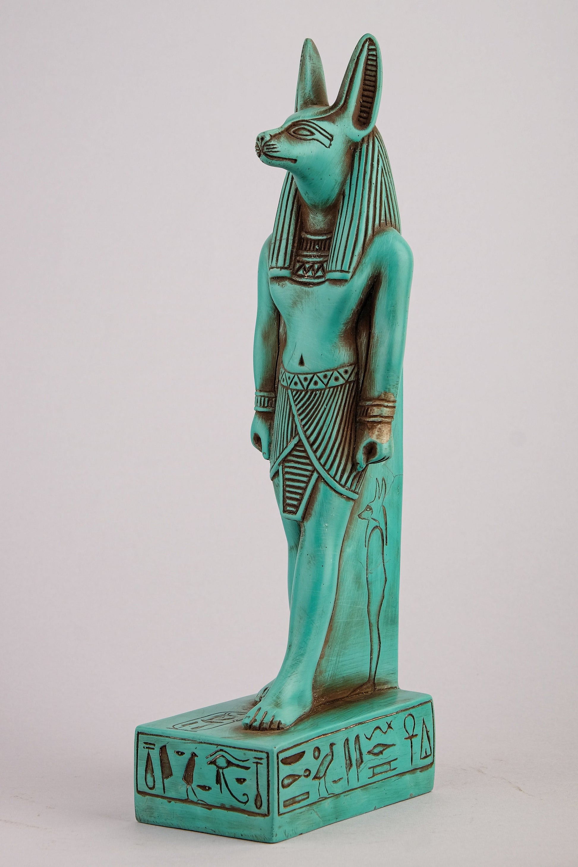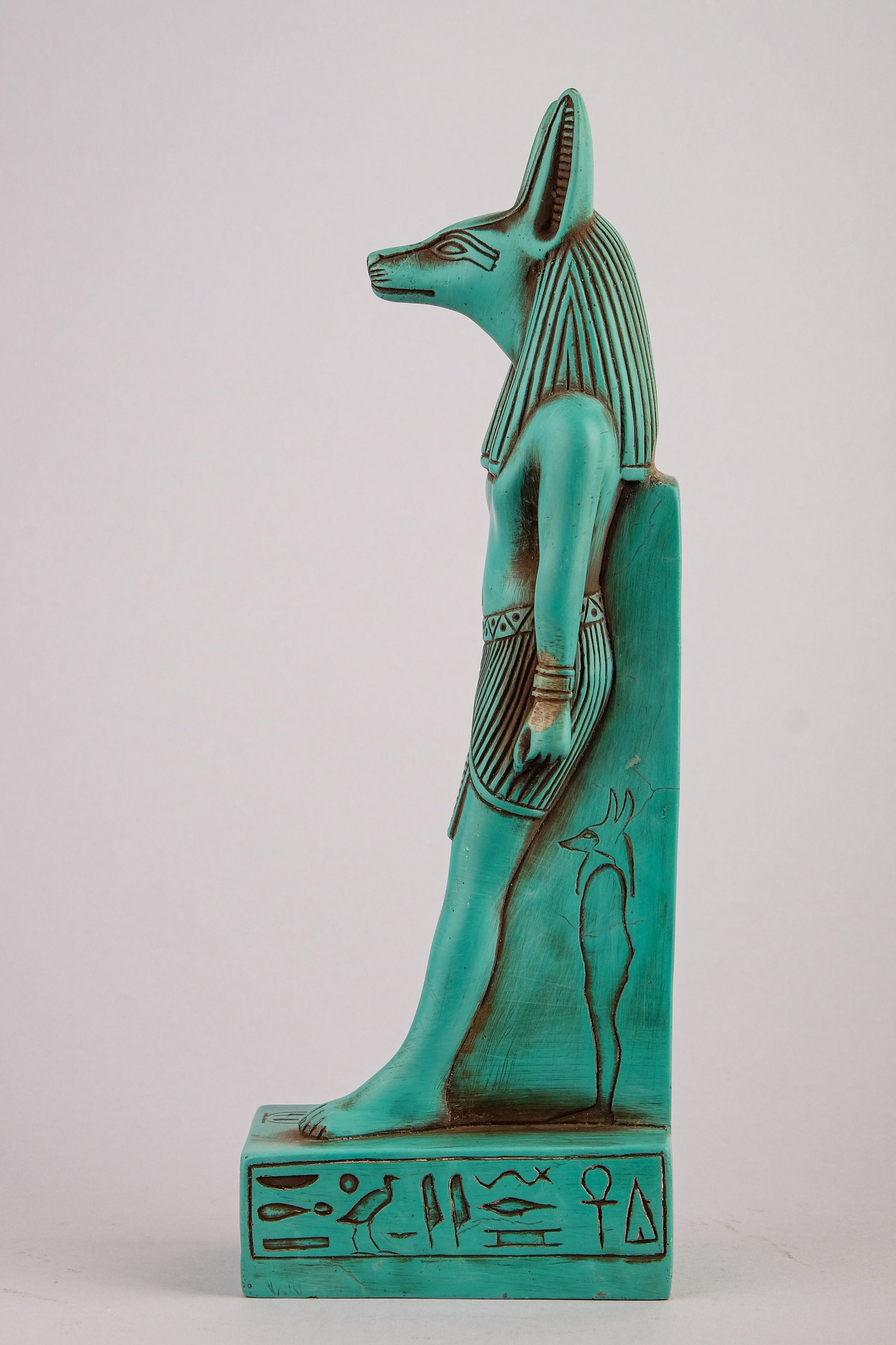 A unique ancient Egyptian statue of Anubis Jackal God of afterlife and mummification standing with jackal head and human body