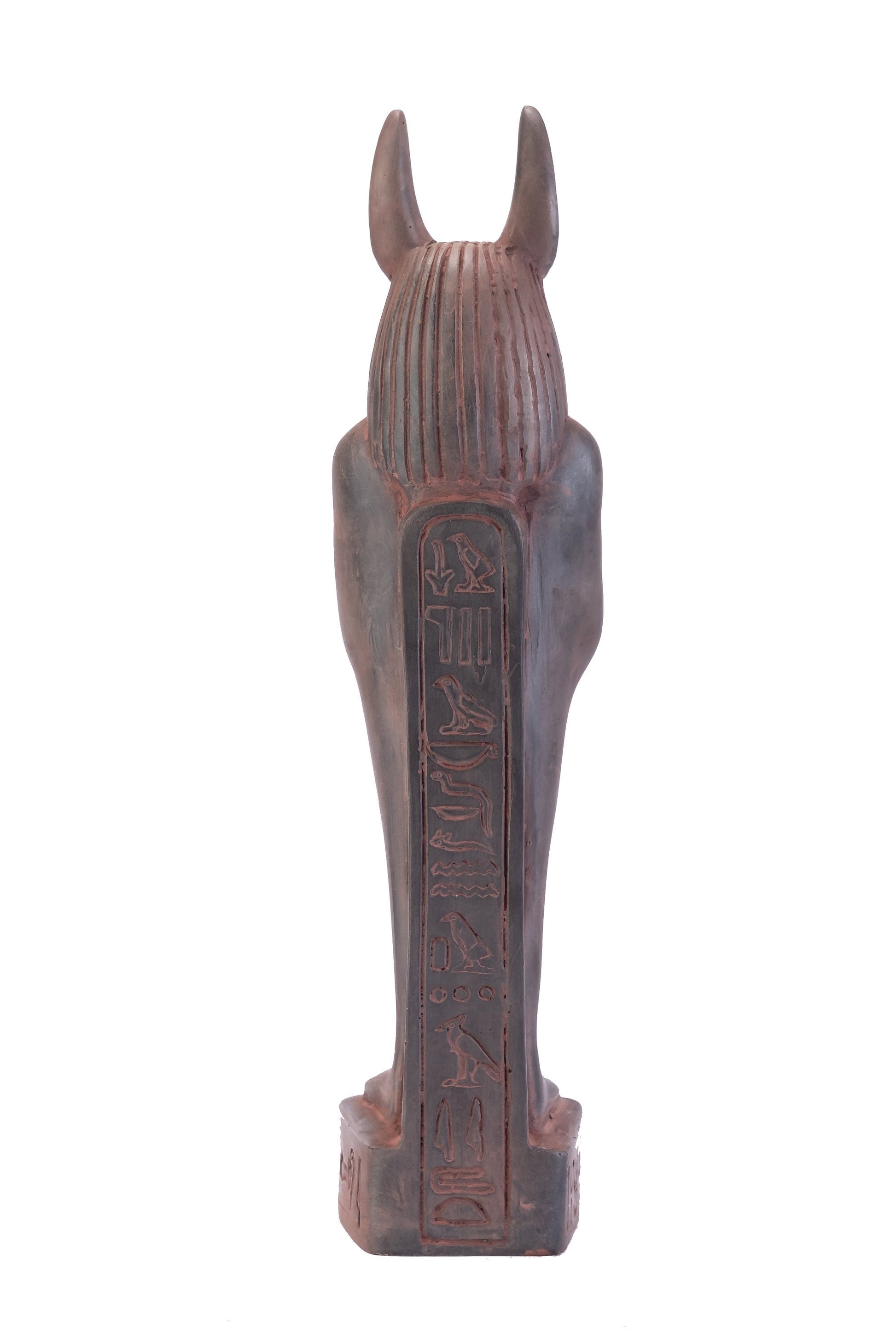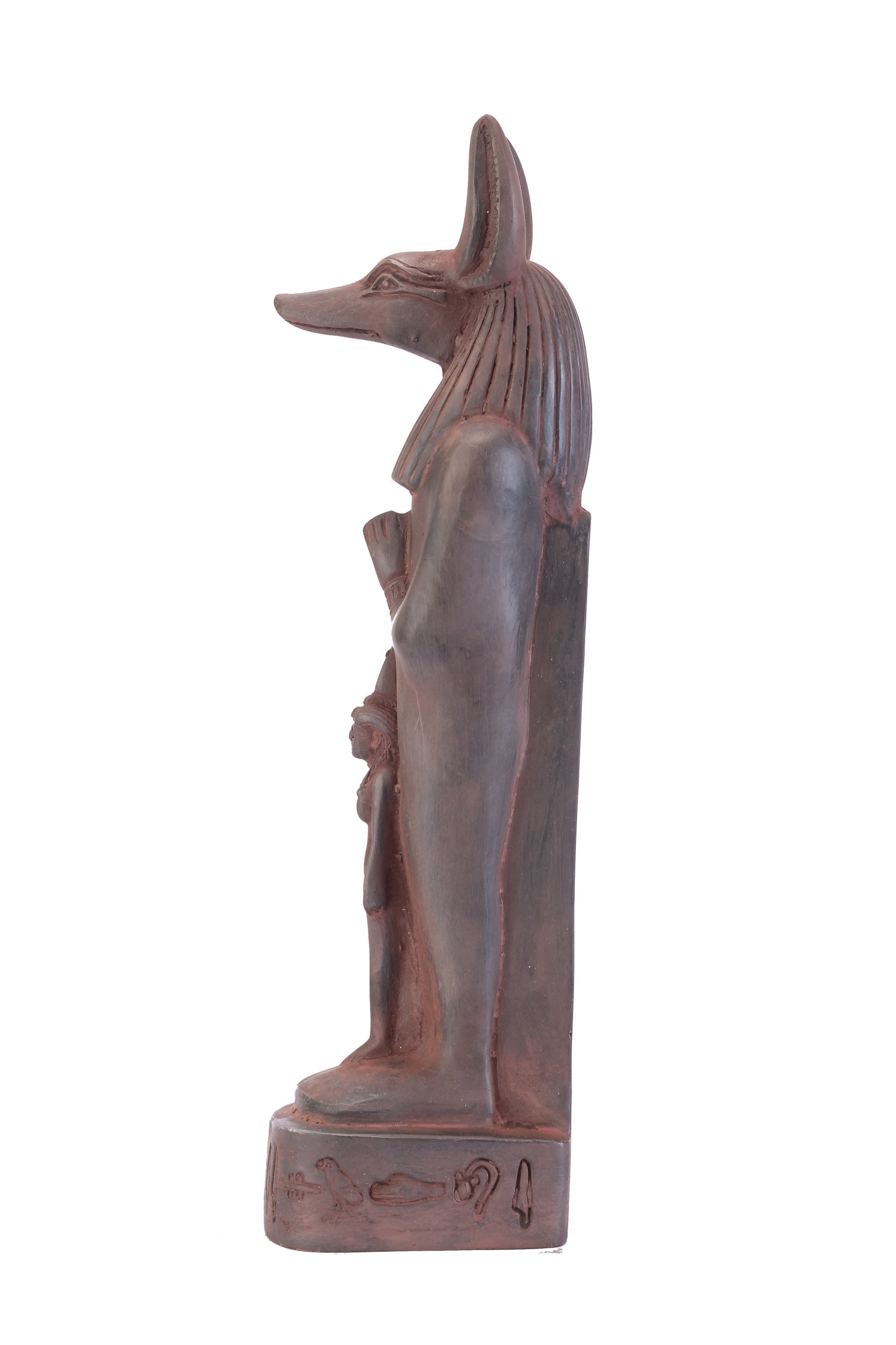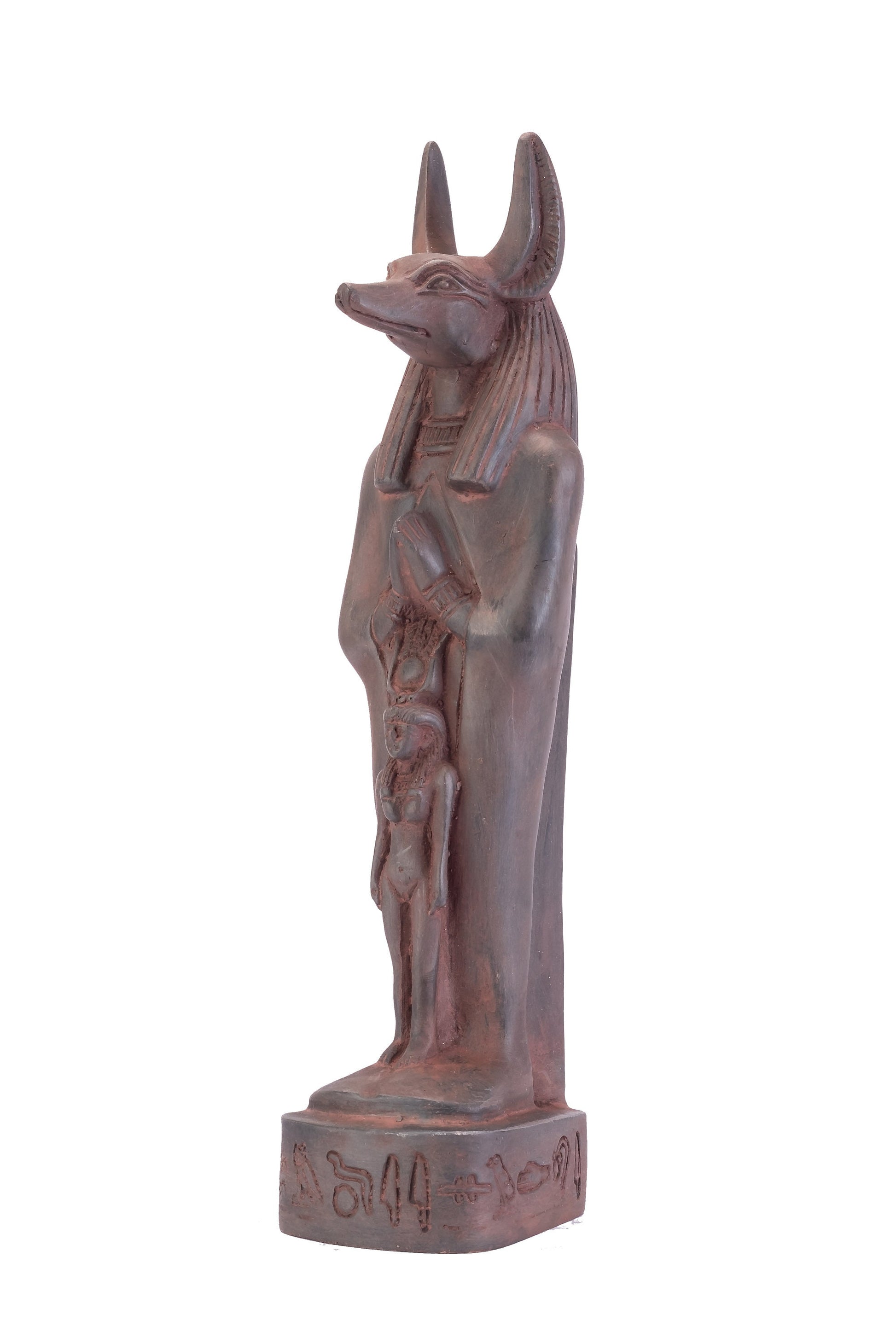 A unique ancient Egyptian statue of Anubis Jackal God of afterlife and mummification standing with jackal head and human body protect Isis