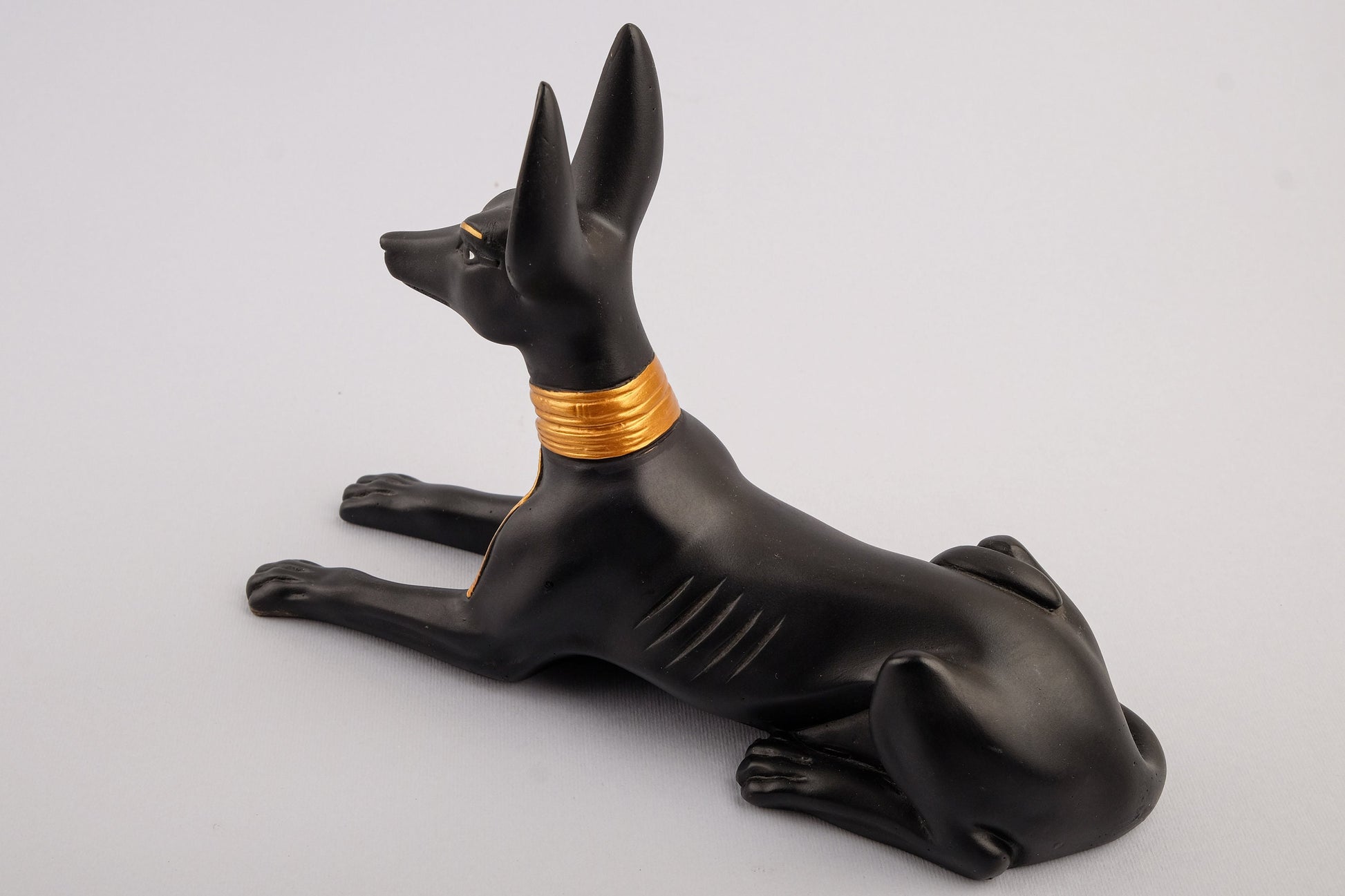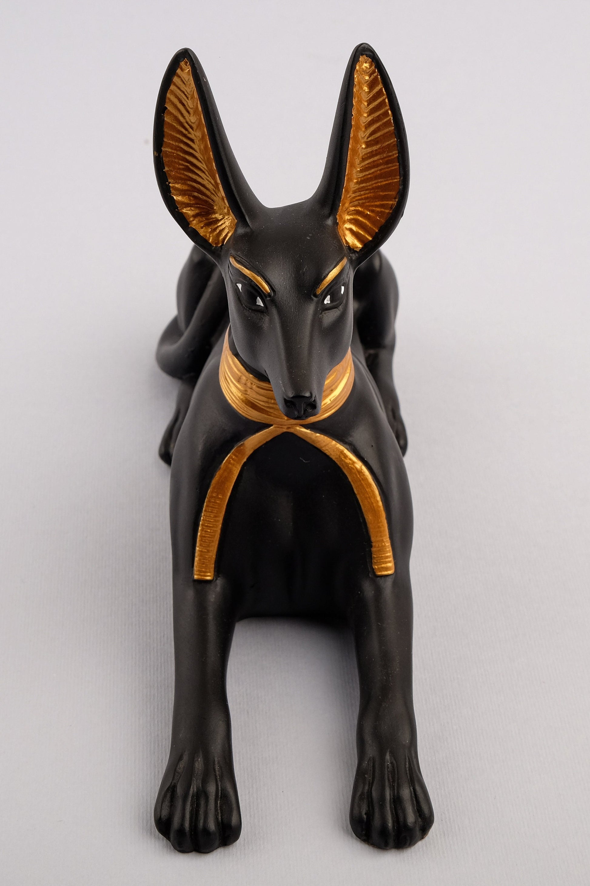 A unique ancient Egyptian statue of Anubis Jackal God of afterlife and mummification, stone black and gold painted made in Egypt