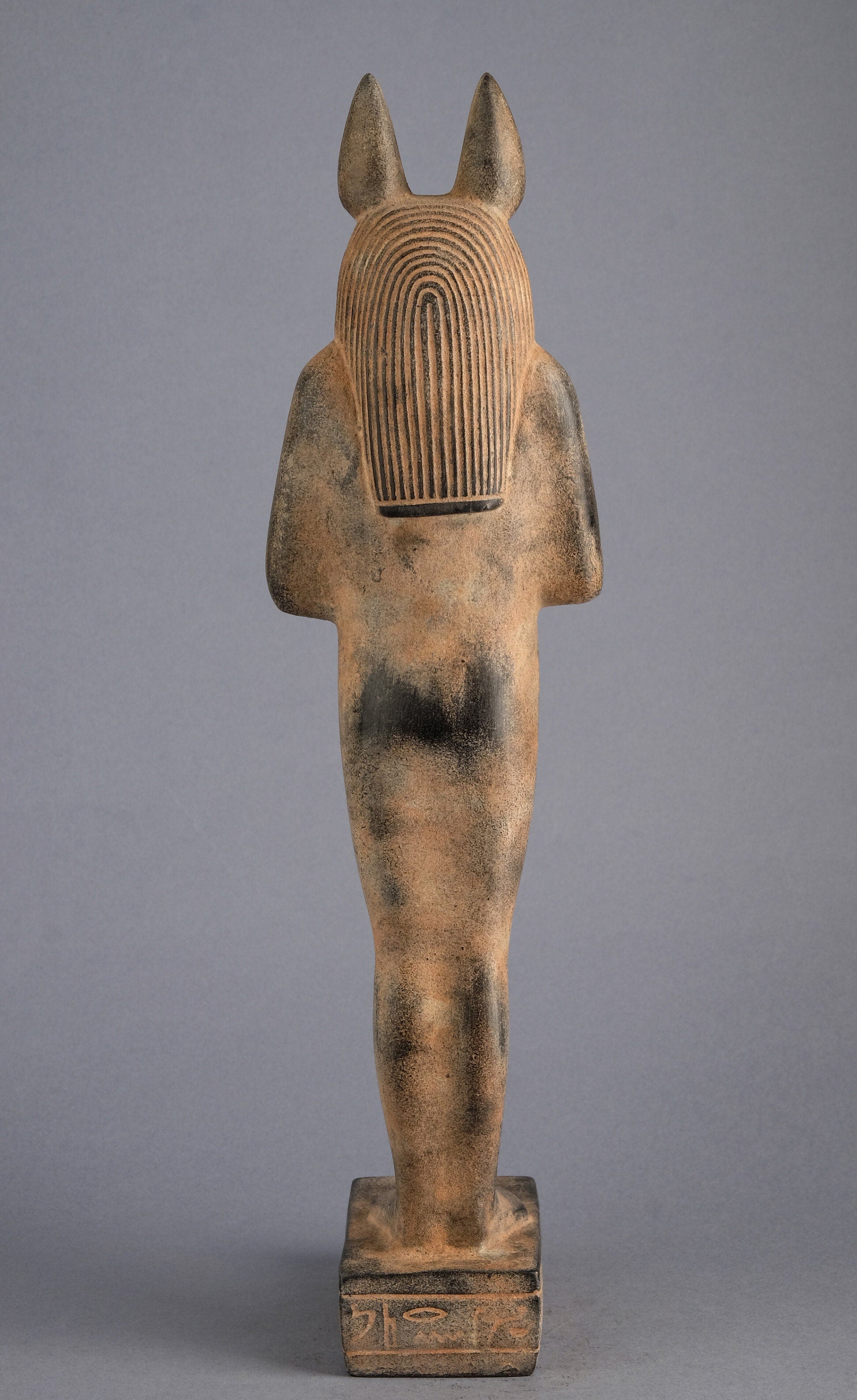 A unique ancient Egyptian statue of Anubis Jackal Symbol of afterlife and mummification standing in form mummy with Jackel head