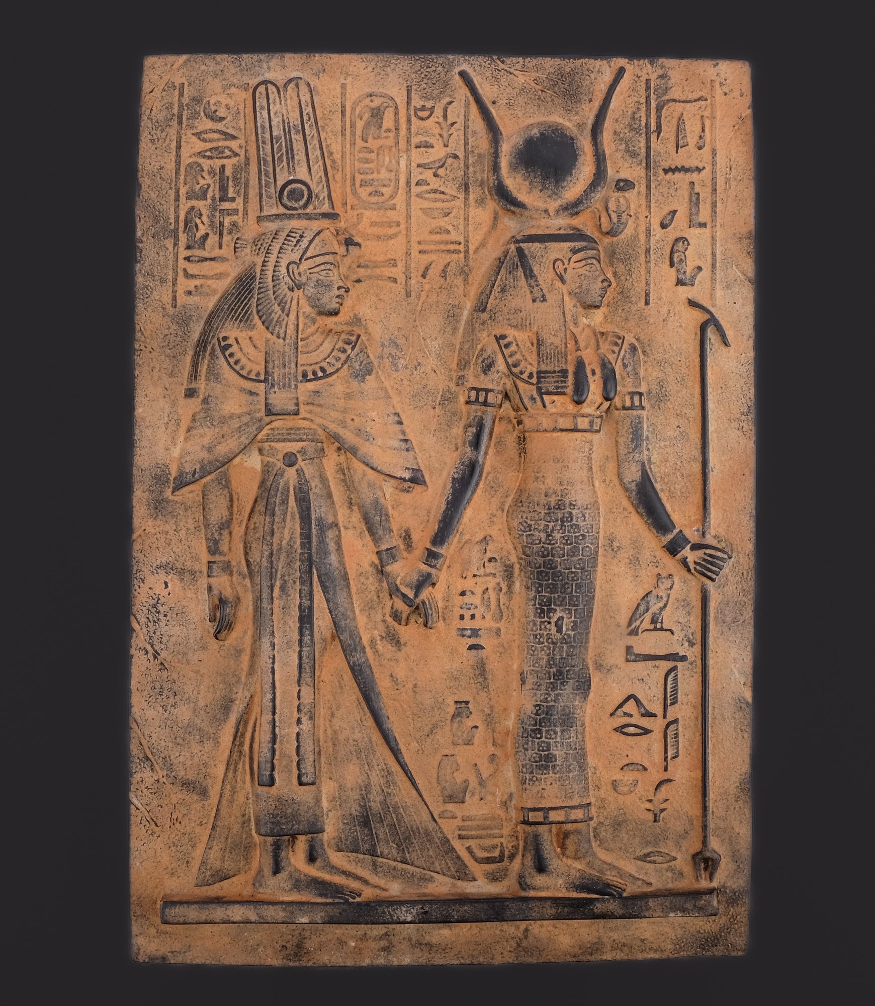 Ancient Egyptian Art Wall Relief Queen Nefertari being Led by Isis black heavy stone hand touching made in Egypt